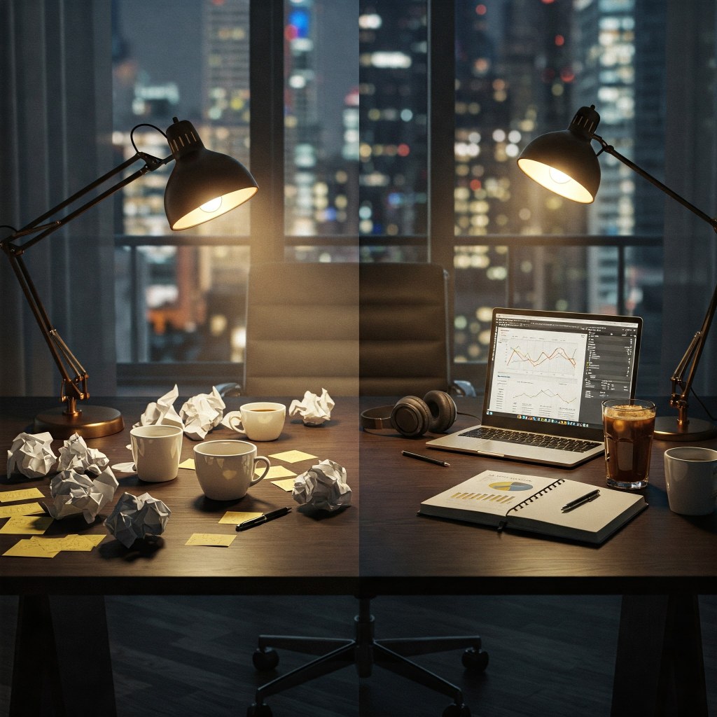 في لحظة واحدة، وجد “فوزووز” نفسه وحيدًا، أمام عمل ناقص، واجتماع مصيري بعد 60 دقيقة. شعر بأن الأزمة تخنقه وأن الفرج مستحيل. بدلاً من الاستسلام للذعر، أغلق “فوزووز” عينيه للحظة. لم يحاول وضع خطة عبقرية، بل كل ما فعله هو أن بحث عن نقطة ثبات في داخله.